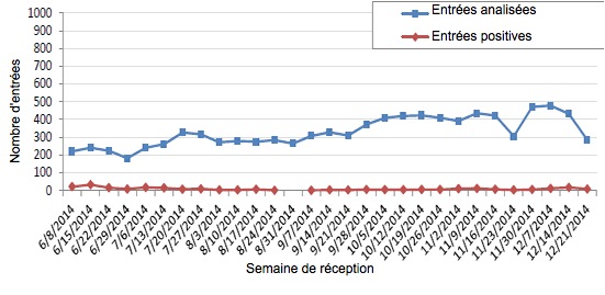 Ci-dessous sont exposées les données relatives au nombre d'échantillons analisés de façon hebdomadaire (sachant que chaque entrée inclut des échantillons recueillis dans une seule ferme en un seul jour).