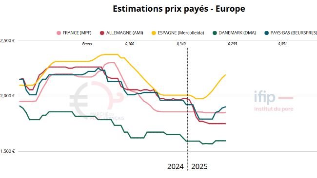 Les prix du porc évoluent différemment selon les marchés : stabilité en Allemagne et en France, hausse en Espagne et aux États-Unis, tandis que la Chine poursuit sa baisse.