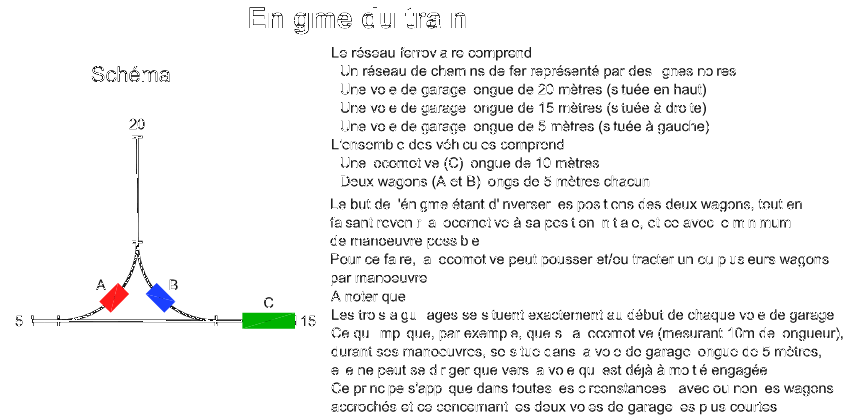 prendre la loco et accrocher le wagon B redescendre dans l'espace 15 m puis pousser et décrocher le wagon B dans le garage 5 m .
