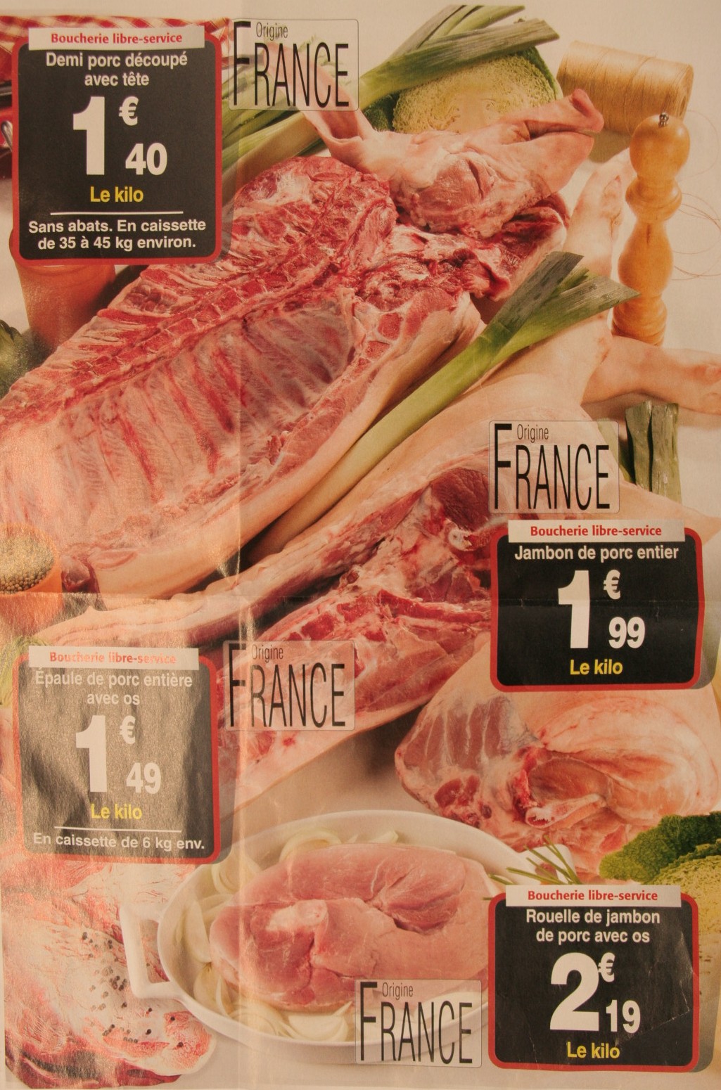 Sachant que le porc part actuellement de nos élevages à 1.15 €, cette promotion est probablement de la vente à perte car il ne reste que 0.25 € pour payer les frais entre l'élevage et le rayon du magasin.