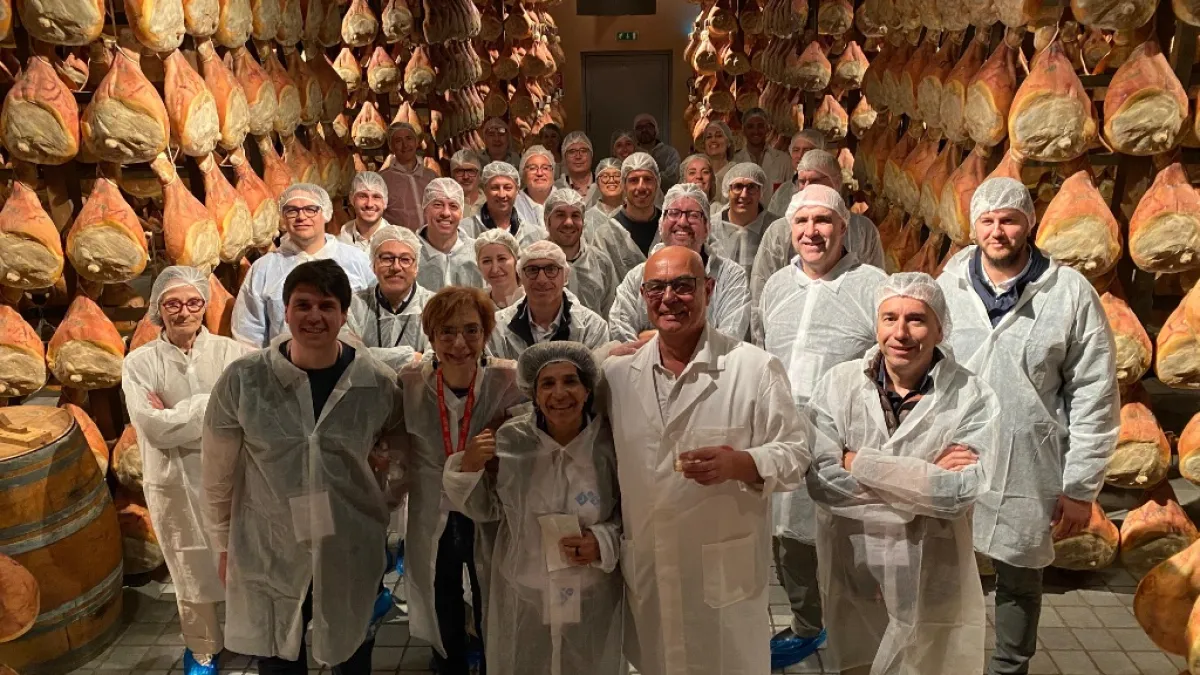 Segundo día del viaje técnico de INNOVACC a Italia con representantes del sector cárnico catalán, organizado con el apoyo de 3tres3.La jornada ha comenzado con la visita a Prosciutto Galloni, donde el grupo ha podido conocer de cerca el proceso de elaboración y los secretos del auténtico jamón de Parma.