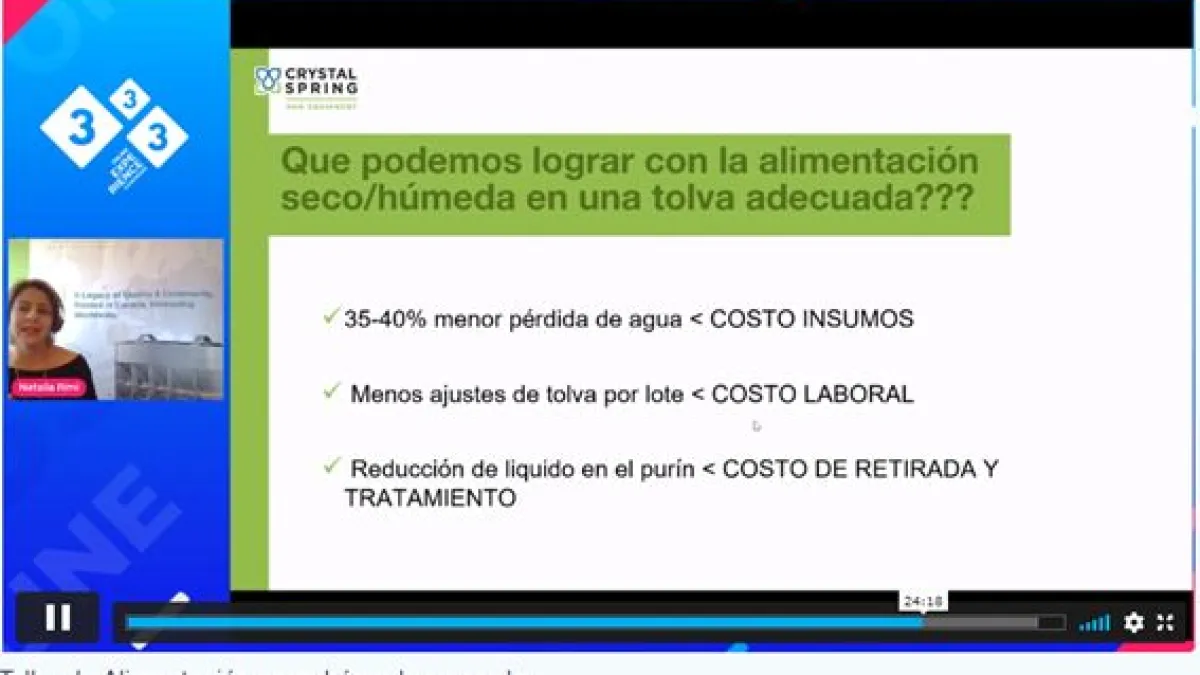 Natalia Rimi, Directora de Estrategia Global para Crystal Spring, muestra las ventajas del uso de tolvas seco/húmedo adecuadas sobre la sanidad, el rendimiento y también sobre la reducción de pérdidas de pienso y agua, en el taller de alimentación seco-húmeda del 333 Experience