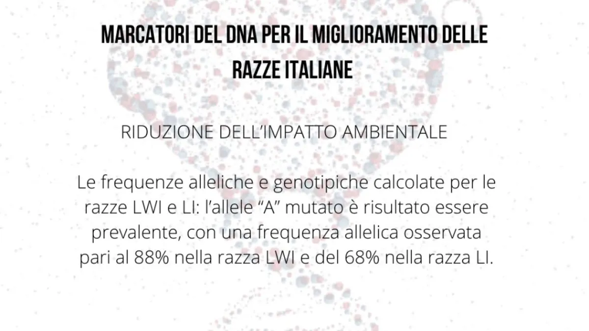 L’allele “A” mutato è risultato essere prevalente, con una frequenza allelica osservata pari al 88% nella razza LWI e del 68% nella razza LI. I risultati sono stati utili per definire le nuove strategie d’ analisi del nuovo progetto SUIS.2 di ANAS, in cui la