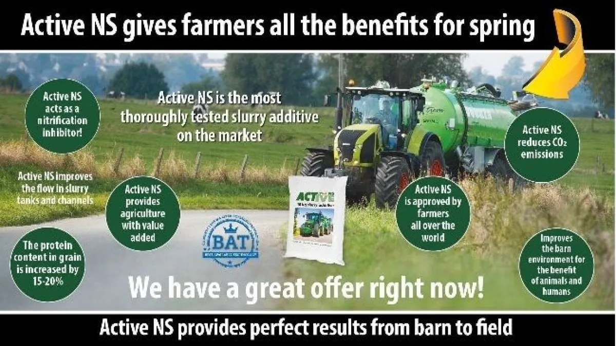 Active NS es un producto natural en polvo, que trabaja según el principio de intercambio de iones con carga negativa y positiva. Esto fija el amoníaco al purín, lo que provoca que se reduzca enormemente las emisiones de