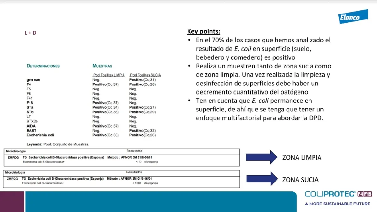 O que fazemos em nossa auditoria? Procure Eshcerichia coli nas superfícies (comedouros, bebedouros e piso) antes e depois da limpeza e desinfeção dos ambientes. O objetivo é revisar a redução de sua presença através de UFC/esponja ou com PCR quantitativo.