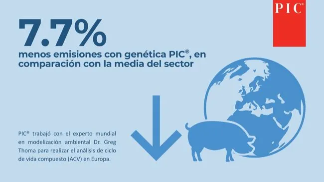 Un nuevo Análisis de Ciclo de Vida (ACV) europeo confirma que un programa completo de genética PIC (macho + hembra) permite una reducción del 7,7 % en las emisiones de gases de efecto invernadero (GEI) en comparación con el promedio del sector.