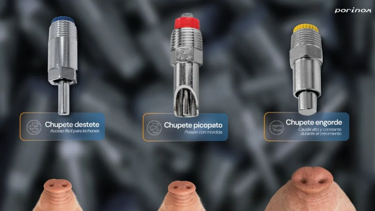 Pico pato: requiere una ligera presión con la mordida para liberar el agua.Cada opción ofrece una experiencia de hidratación distinta según la preferencia del ganadero o las condiciones de la granja.