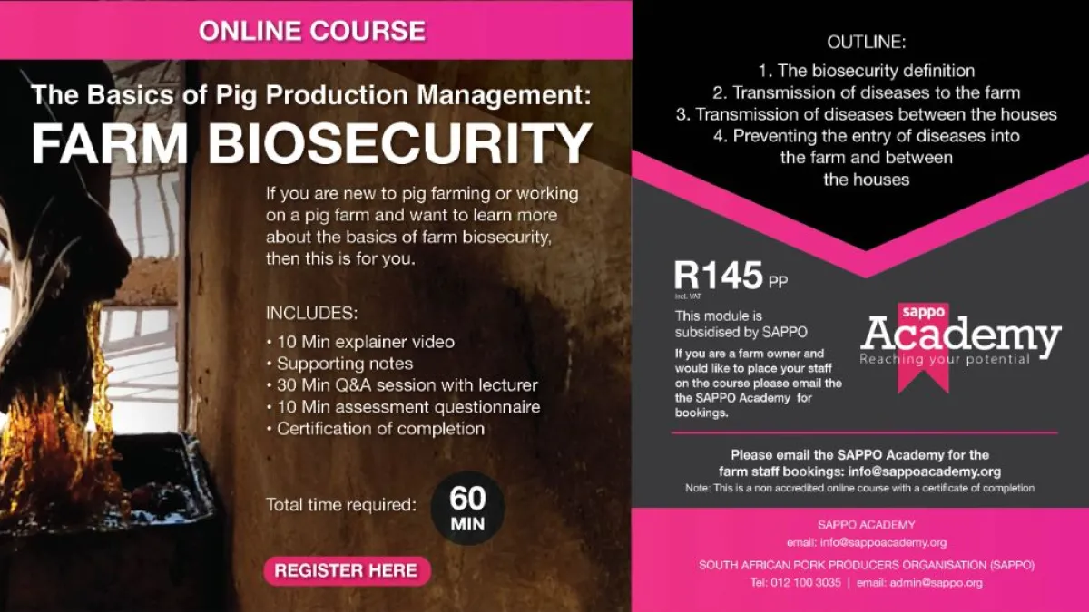 With the increase in the number of disease outbreaks, specifically Foot and Mouth (FMD) and African Swine Fever (ASF), the best way to protect yourself is by applying sound biosecurity measures. Enrol at SAPPO Academy to learn more about Biosecurity.