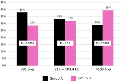 La boisson protéinée isotonique pour porcs * peut également être utilisée au sevrage pour faciliter la transition et la consommation d’aliment. Pour cela, on la mélange à l’aliment, pour obtenir une bouillie. Donner cette bouillie lors du sevrage a un impact positif sur les consommations et le gain de poids, en particulier pour les porcs de poids moyen et les porcs légers (Firth et al., 2017 b). Dans une étude récente portant sur 3.862 porcelets, les portées ont été réparties dans l'un des 2 groupes, contrôle (groupe A : 1.969 porcelets) ou supplémenté avec une boisson protéinée isotonique (groupe B : 1.893 porcelets). Les portées du groupe A ont reçu un aliment sous la mère granulé de la naissance au sevrage. Les portées du groupe B ont reçu, en plus, la solution protéinée isotonique du jour 2 au jour 8 de vie, puis 3 jours avant le sevrage, et enfin pendant les 3 premiers jours après le sevrage, mélangée avec l’aliment. Tous les porcelets ont été identifiés au jour 2 avec des étiquettes au niveau de l’oreille, et les poids individuels ont été enregistrés à la naissance, au sevrage, en sortie de nurserie et à 168 jours d’âge. La mortalité avant sevrage a été réduite de 22,8% (14,2% dans le groupe A contre 10,9% dans le groupe B), un résultat conforme aux observations précédentes. Le poids moyen au sevrage n'était pas significativement différent entre les groupes. En sortie de nurserie, les porcs du groupe B pesaient 0,41 kg (1,7%) de plus que les porcs du groupe A (P = 0,10) et à 168 jours d'âge, les porcs du groupe B pesaient 3,08 kg (3,2%) de plus que les porcs témoins. Cette différence était très significative, avec une valeur P = 0,002 (Cortyl et al., 2019). Une analyse plus approfondie, évaluant dans quelle mesure l’effet du traitement était conditionné par les poids à la naissance (léger, inférieur à 1 kg ; moyen, entre 1 et 1,6 kg ; et élevé, supérieur à 1,6 kg), a démontré que toutes les catégories de porcs bénéficiaient du traitement. Il est également intéressant d’observer que cette étude ne confirme pas la théorie communément admise selon laquelle les porcs légers à la naissance ne peuvent pas rattraper leur retard. Les résultats de cet essai montrent que c’est possible. Le groupe B comptait également moins de porcs terminant à <91,6 kg et plus de porcs terminant à> 103,4 kg (figure 1). Cela confirme que tous les porcelets, pas seulement les petits et légers à la naissance, bénéficient de l’apport nutritionnel spécifique de cette boisson protéinée isotonique.