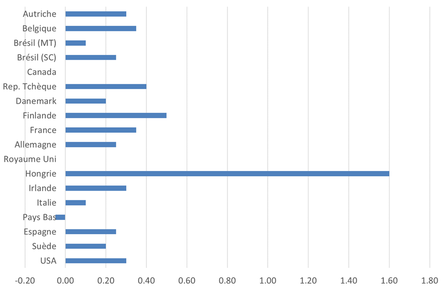 Selon les données d’INTERPIG (voir figure 1), de 2018 à 2020, le nombre moyen de porcelets nés vifs a augmenté de 0,62 porcelet, soit 0,31 par an. La plus forte augmentation (+1,6 porc par an) a été enregistrée en Hongrie, qui était également le pays avec le plus petit nombre de nés vifs en 2018 (12,2 porcs par portée). Aux Pays-Bas, où le nombre de nés vifs était parmi les plus élevés en 2018, on observe une réduction de 0,05 porc en moyenne entre 2018 et 2020. Mais au Danemark, où les truies comptaient déjà 17,7 nés vifs par portée en 2018, les performances ont continué à augmenter de 0,20 porc supplémentaire par an.