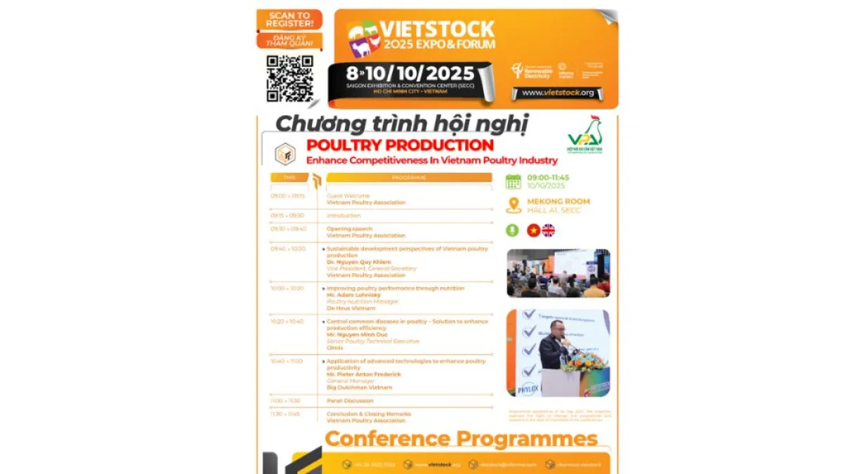 At 9 PM on October 10 at the Mekong Conference Room, Hall A1, the Vietnam Poultry Association (VPA) will deliver a Conference on “Enhance Competitiveness in Vietnam Poultry Industry”, providing valuable insights for the country’s livestock sector.