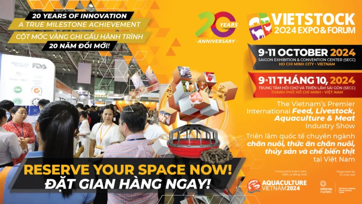 Vietstock 2024 and AQUACULTURE VIETNAM EXPO & FORUM exhibition will be a comprehensive event, connecting the entire value chain of the livestock and fisheries industry in Vietnam and the ASEAN region.Dates: October 9 – 11, 2024 (Wednesday – Friday)