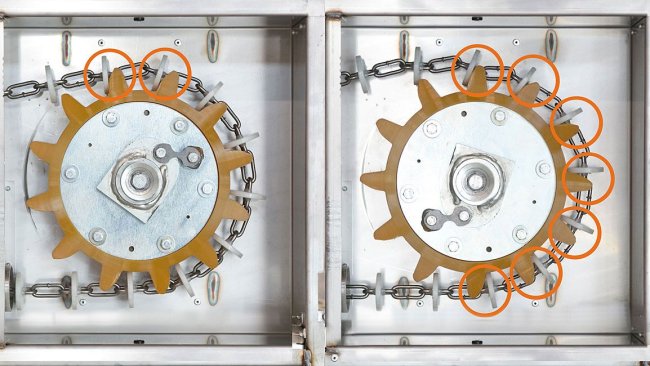 Un bel effet secondaire pour de meilleures conditions de travail dans le bâtiment : la chaîne fonctionne pratiquement sans « frapper » et donc très silencieusement, car les dents élastiques assurent un mouvement d’entrée et de sortie en douceur.