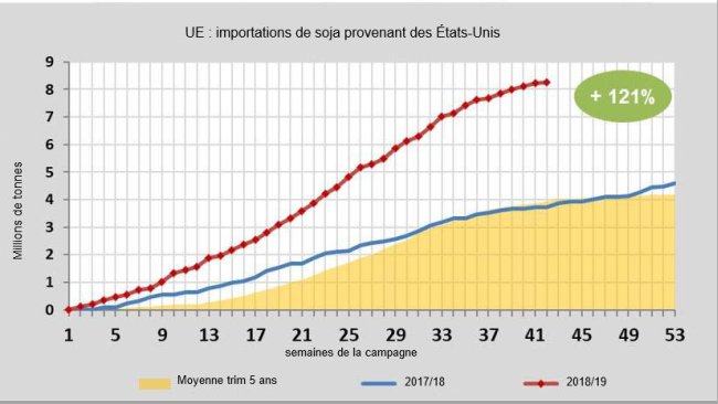 Les importations de soja provenant des États-Unis dans l'Union européenne ont augmenté de 121 % au cours de la campagne actuelle (de juillet 2018 à la mi-avril 2019).