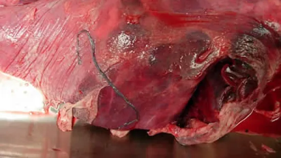Cette image en coupe transversale d'un poumon de porc est caractéristique d'une pneumonie provoquée par: