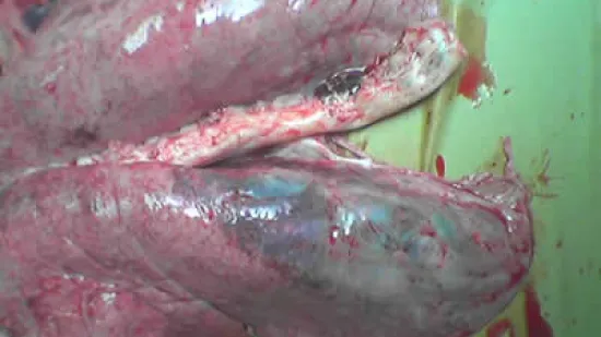 Cette image en coupe transversale d'un poumon de porc est caractéristique d'une pneumonie provoquée par: