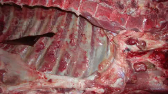 Cette image en coupe transversale d'un poumon de porc est caractéristique d'une pneumonie provoquée par: