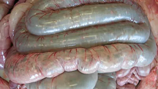 On constate une augmentation de la mortalité par mort subite chez les porcs d'engraissement. Les porcs post mortem présentent des anses intestinales distendues par des gaz, une couleur pourpre intense et sont remplis de liquide contenant beaucoup de sang.
