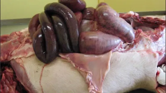 On constate une augmentation de la mortalité par mort subite chez les porcs d'engraissement. Les porcs post mortem présentent des anses intestinales distendues par des gaz, une couleur pourpre intense et sont remplis de liquide contenant beaucoup de sang.