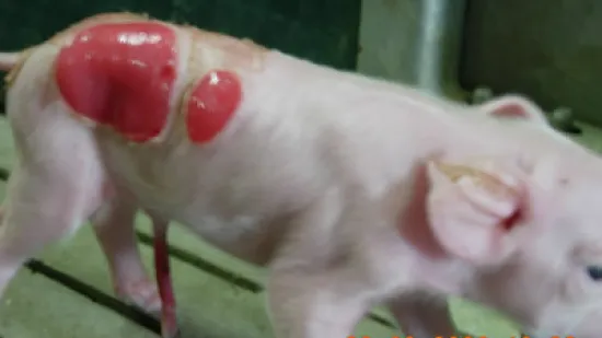 On constate une augmentation de la mortalité par mort subite chez les porcs d'engraissement. Les porcs post mortem présentent des anses intestinales distendues par des gaz, une couleur pourpre intense et sont remplis de liquide contenant beaucoup de sang.