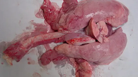 Cette image en coupe transversale d'un poumon de porc est caractéristique d'une pneumonie provoquée par: