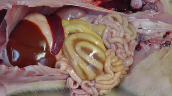 On constate une augmentation de la mortalité par mort subite chez les porcs d'engraissement. Les porcs post mortem présentent des anses intestinales distendues par des gaz, une couleur pourpre intense et sont remplis de liquide contenant beaucoup de sang.