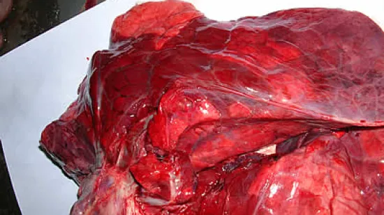 Cette image en coupe transversale d'un poumon de porc est caractéristique d'une pneumonie provoquée par: