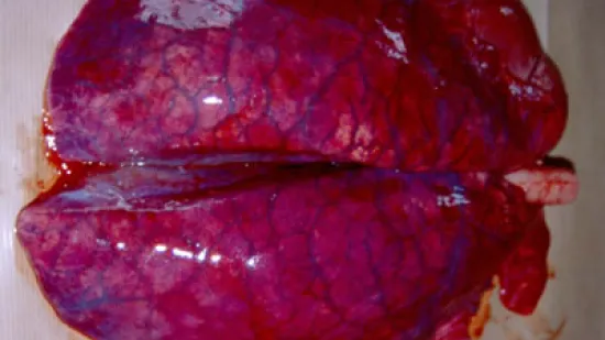 Cette image en coupe transversale d'un poumon de porc est caractéristique d'une pneumonie provoquée par: