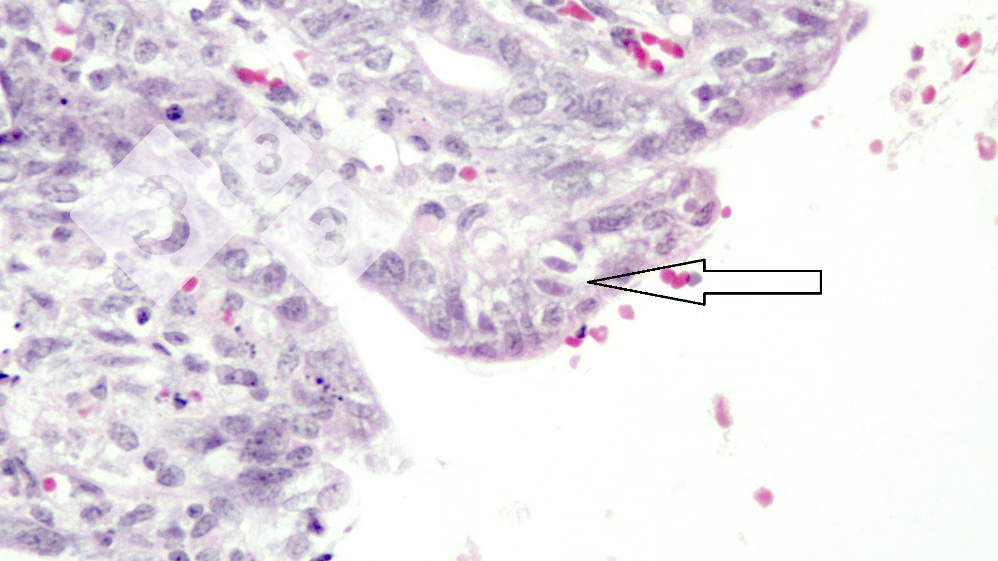 Quels sont les organismes (flèche) dans la muqueuse de l'intestin grêle de ce porcelet avec diarrhée?