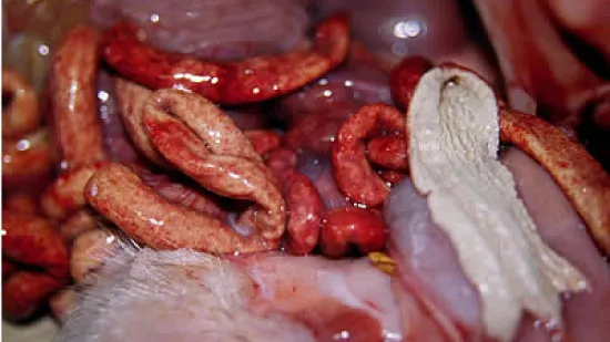 On constate une augmentation de la mortalité par mort subite chez les porcs d'engraissement. Les porcs post mortem présentent des anses intestinales distendues par des gaz, une couleur pourpre intense et sont remplis de liquide contenant beaucoup de sang.
