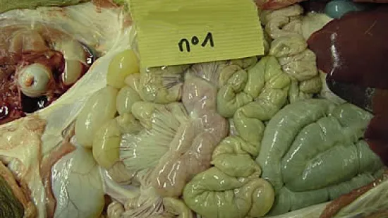 On constate une augmentation de la mortalité par mort subite chez les porcs d'engraissement. Les porcs post mortem présentent des anses intestinales distendues par des gaz, une couleur pourpre intense et sont remplis de liquide contenant beaucoup de sang.