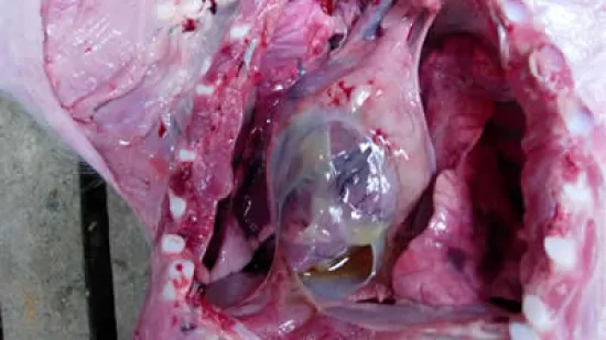 Une épidémie de mort subite touche des porcs de 6 semaines. À l'autopsie, le sac péricardique est distendu et contient un liquide de couleur paille contenant des filaments de fibrine. Le cœur présente des zones de nécrose. Quelle est la cause probable ?