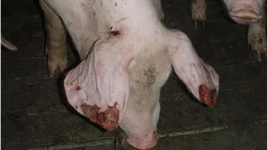 On constate une augmentation de la mortalité par mort subite chez les porcs d'engraissement. Les porcs post mortem présentent des anses intestinales distendues par des gaz, une couleur pourpre intense et sont remplis de liquide contenant beaucoup de sang.