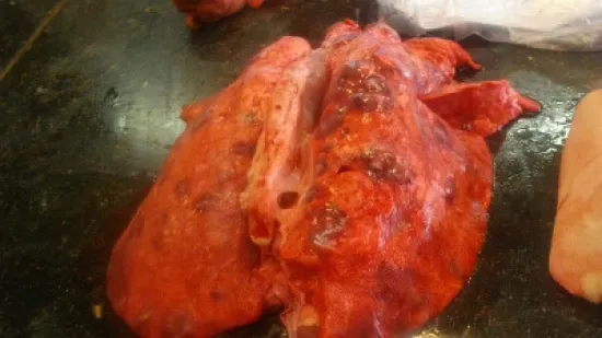 Cette image en coupe transversale d'un poumon de porc est caractéristique d'une pneumonie provoquée par: