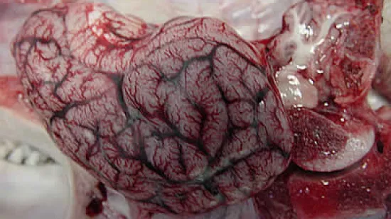 Cette image en coupe transversale d'un poumon de porc est caractéristique d'une pneumonie provoquée par: