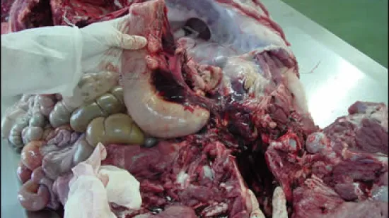 On constate une augmentation de la mortalité par mort subite chez les porcs d'engraissement. Les porcs post mortem présentent des anses intestinales distendues par des gaz, une couleur pourpre intense et sont remplis de liquide contenant beaucoup de sang.