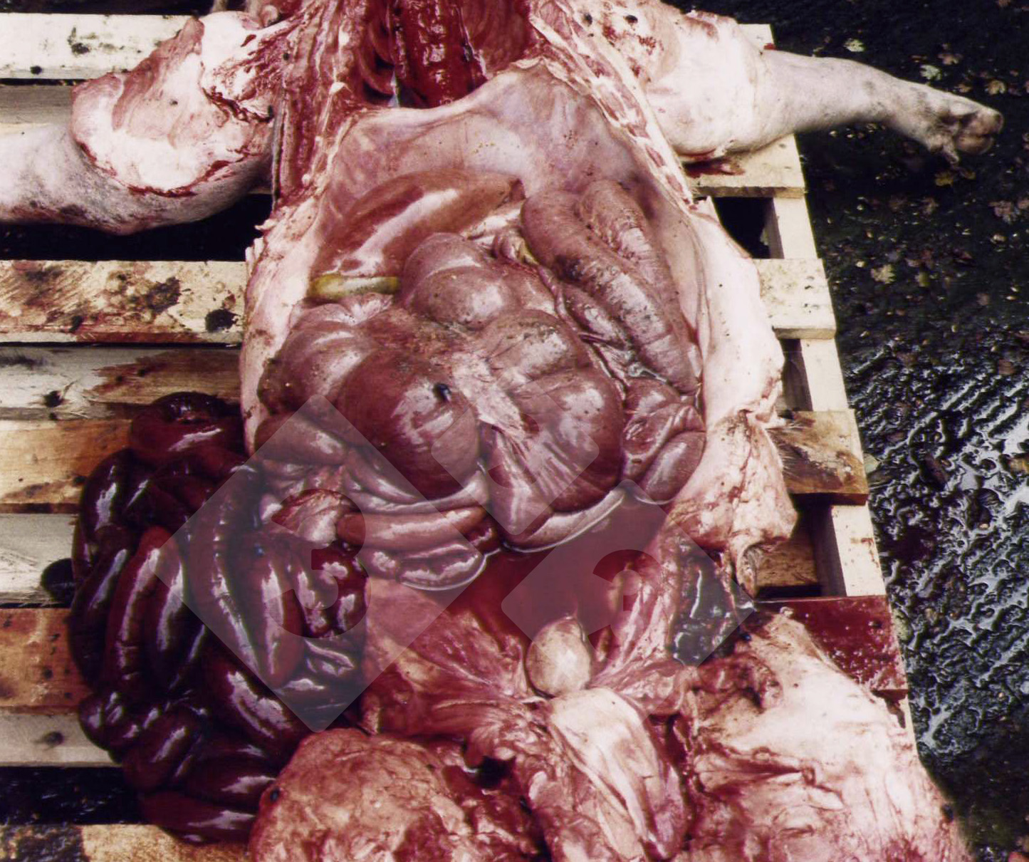 On constate une augmentation de la mortalité par mort subite chez les porcs d'engraissement. Les porcs post mortem présentent des anses intestinales distendues par des gaz, une couleur pourpre intense et sont remplis de liquide contenant beaucoup de sang.