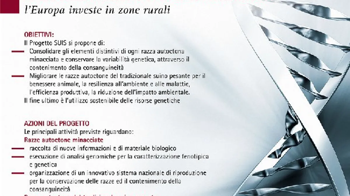 Il progetto è un’importante novità per il miglioramento genetico delle razze large White, Landrace e Duroc italiane selezionate per il suino pesante DOP. Il progetto prevede l’utilizzo delle nuove conoscenze della genomica (DNA) per migliorare in modo più efficace l’efficienza produttiva dei suini e delle scrofe, per selezionare suini più docili e adatti all’allevamento in gruppo, per ottenere suini più resistenti alle malattie (PRRS e enteriti) ed all’aumento delle temperature estive.