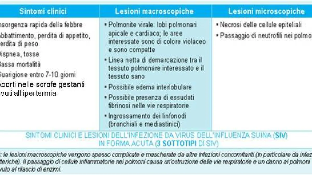 Il SIV è uno dei pochissimi patogeni primari dell'apparato respiratorio del suino e da solo è in grado di indurre la malattia e le lesioni polmonari ad essa associate (vedere Tabella I). Tuttavia, le infezioni subcliniche asintomatiche sono molto comuni, incluse diverse infezioni dovute a sottotipi del virus. Sembra che sia necessaria una massiccia replicazione del virus per indurre una malattia respiratoria acuta, che probabilmente deriva da un'eccessiva produzione di citochine pro-infiammatorie.