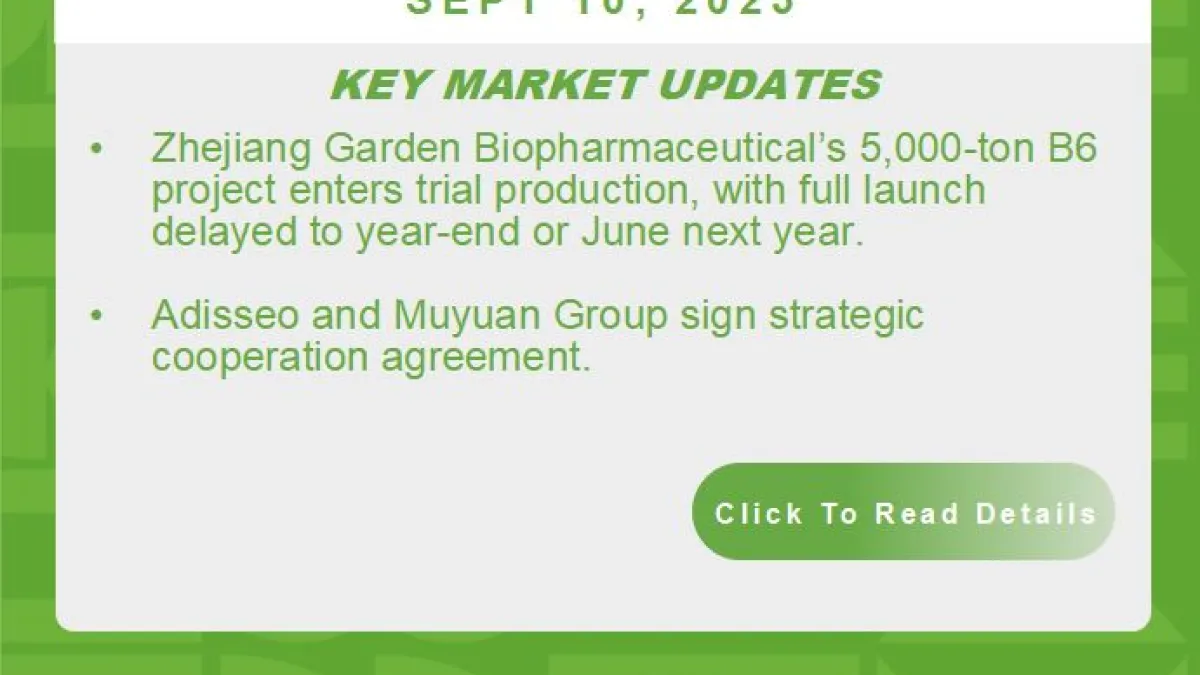 Zhejiang Garden Biopharmaceutical’s 5,000-ton Vitamin B6 project enters trial production; full launch delayed to year-end or mid-2026
