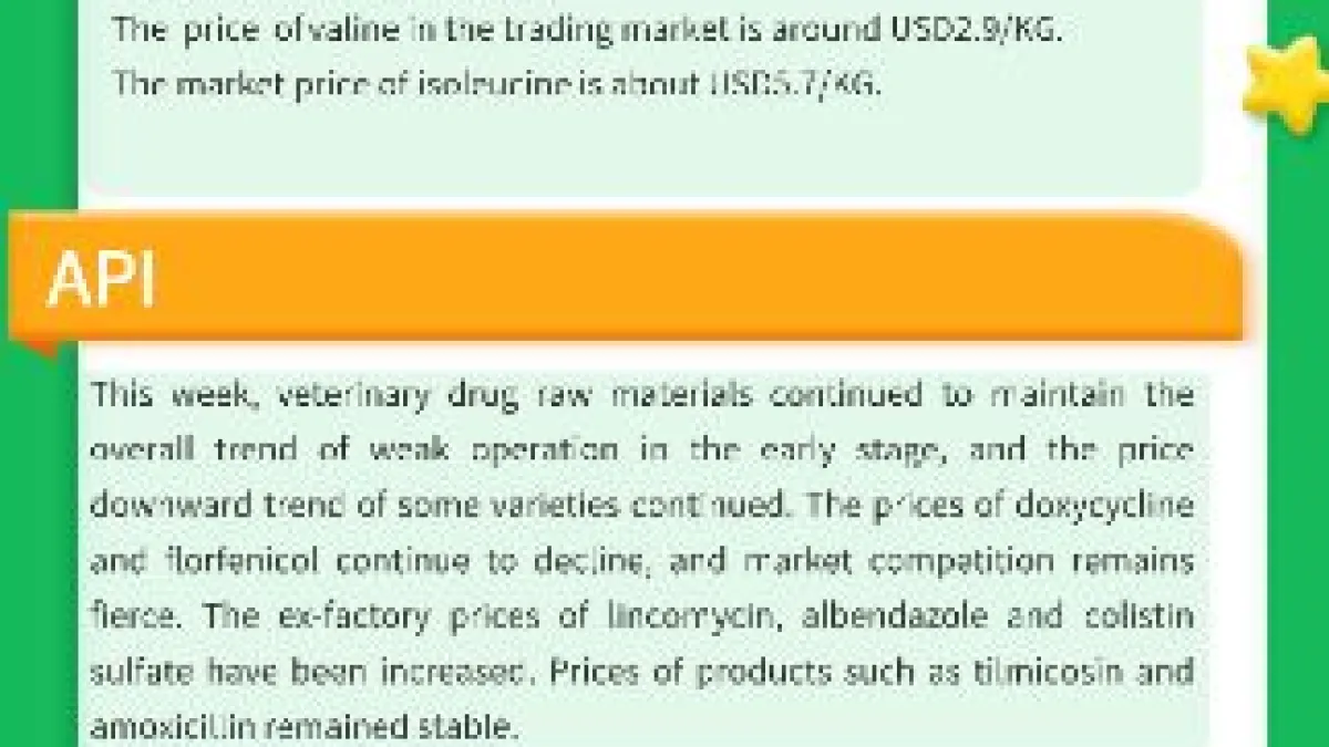 Amino Acids: Due to the soybean meal market for soybean meal, end-users are cautious in purchasing, and the overall market price of small varieties of amino acids has been weak. The prices of valine and isoleucine are weakly stable.
